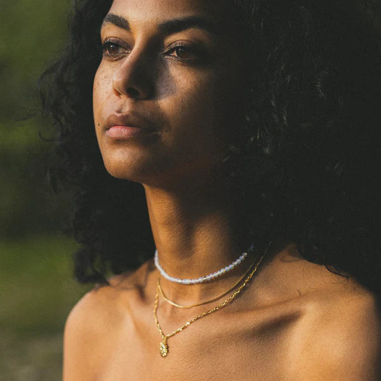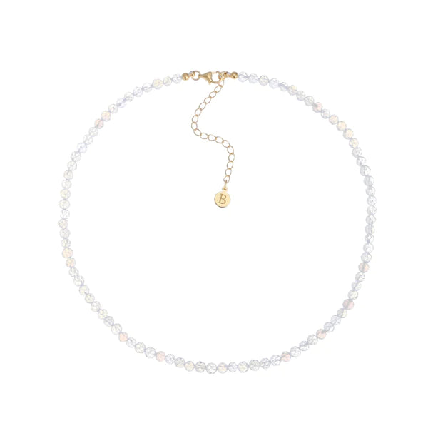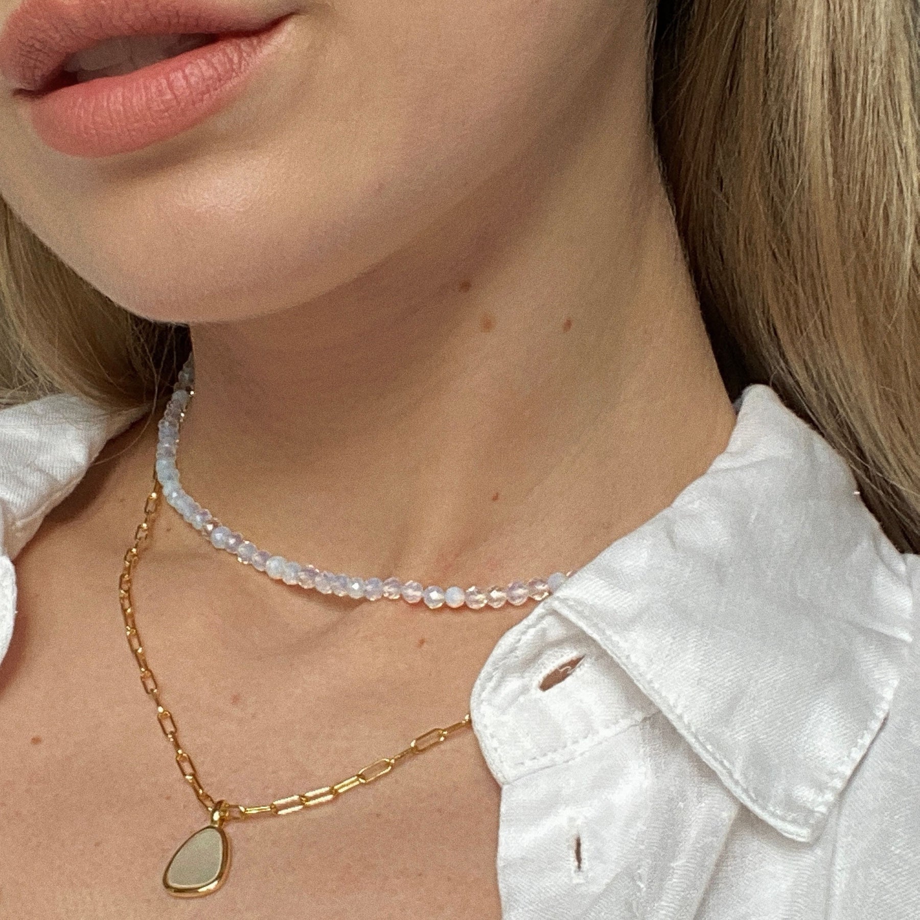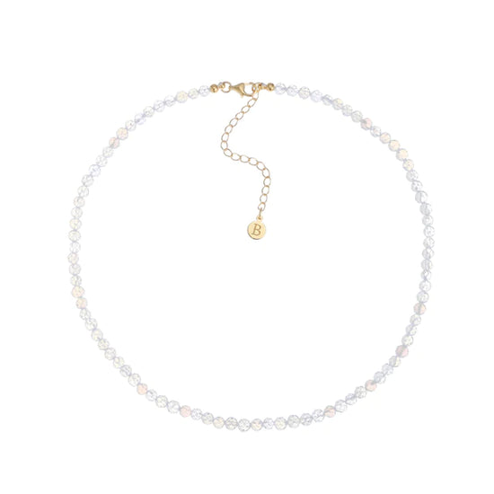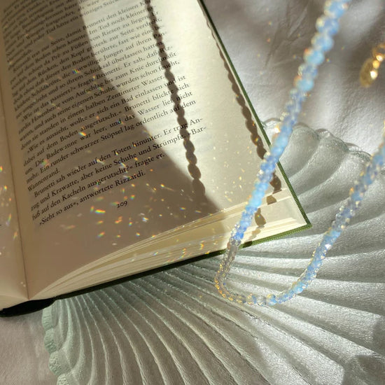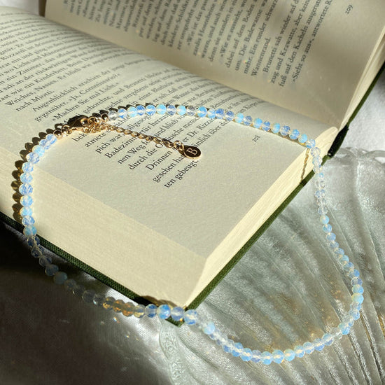 Der traumhaft schimmernder Choker Victoria vom Münchener Atelier Brandlinger ist mit kleinen, mehrfach facettierten Perlen aus Opalith besetzt. Die Perlen schimmern im Licht leicht milchig, weshalb sie ebenso Opalith-Mondsteine genannt werden. Dem Opalith wird eine stressmilderne Wirkung nachgesagt, die zu mehr Ruhe und Ausgeglichenheit verhelfen soll. Sobald die leicht kombinierbare, eng am Hals anliegende Halskette bei Lichteinfall zu funkeln anfängt, wird man automatisch von ihrer Schönheit in den Bann gezogen.