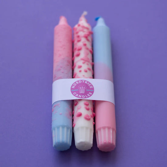 Ein Set aus drei handgefertigten Kerzen in einzigartigen Farben, die in Kerzenwachs getaucht und verziert sind.