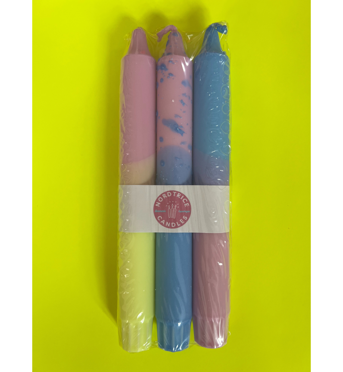 Ein Set aus drei handgefertigten Kerzen in einzigartigen Farben, die in Kerzenwachs getaucht und verziert sind.