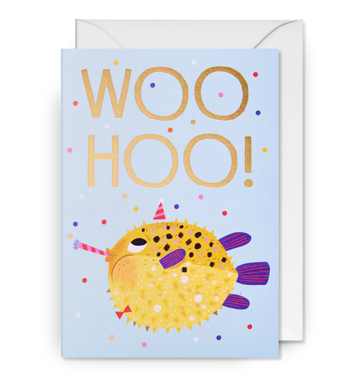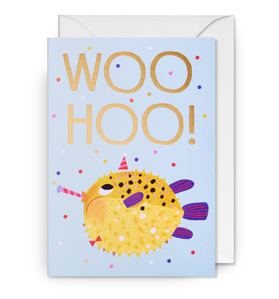 Die schön illustrierte Geburtstagskarte mit einem in Partystimmung zelebrierenden Kugelfisch "WOO HOO!" ist ideal für die kleinen Geburtstagsinder! Die ausdrucksvolle Botschaft "WOO HOO!" des Kugelfisches ist auch perfekt für das bestandene Seepferdchen, weitere Schwimmabzeichen oder sportliche Abzeichen.