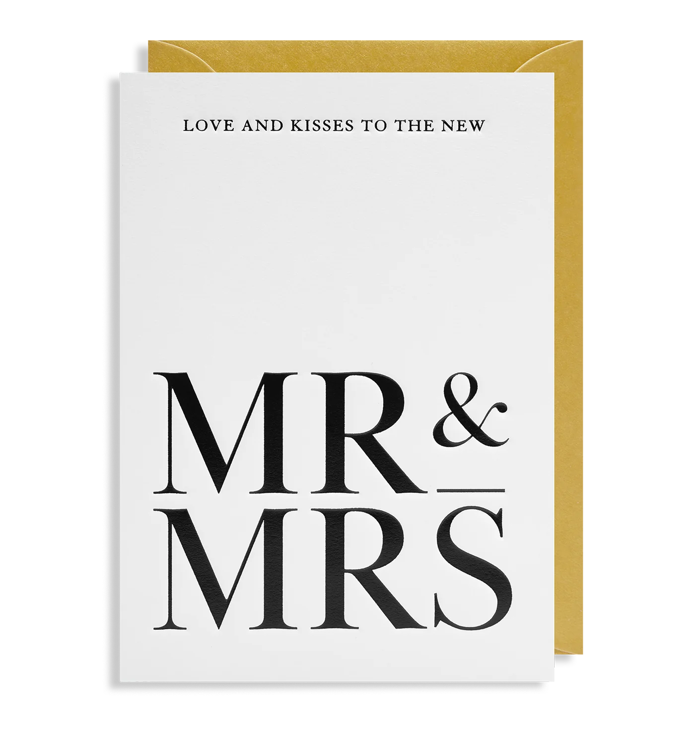 Die lässige Eleganz dieser Hochzeitskarte gepaart mit der liebevollen Botschaft "Love & Kisses To The New MR & MRS" als Letterpress wird durch den goldfarbenen, dezent glitzernden Umschlag abgerundet. Gratulation an das Hochzeitspaar!