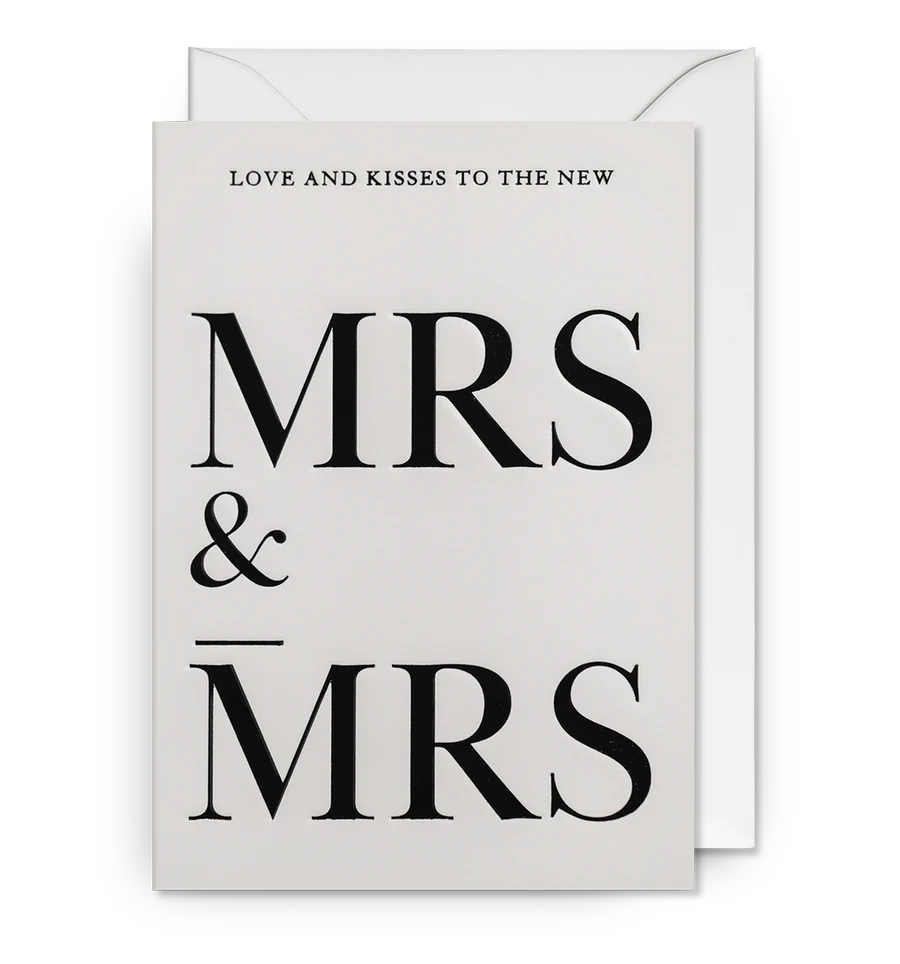 Die lässige Eleganz dieser Hochzeitskarte gepaart mit der liebevollen Botschaft "Love & Kisses To The New MRS & MRS" als Letterpress wird durch den weißen Umschlag abgerundet. Gratulation an das Hochzeitspaar!