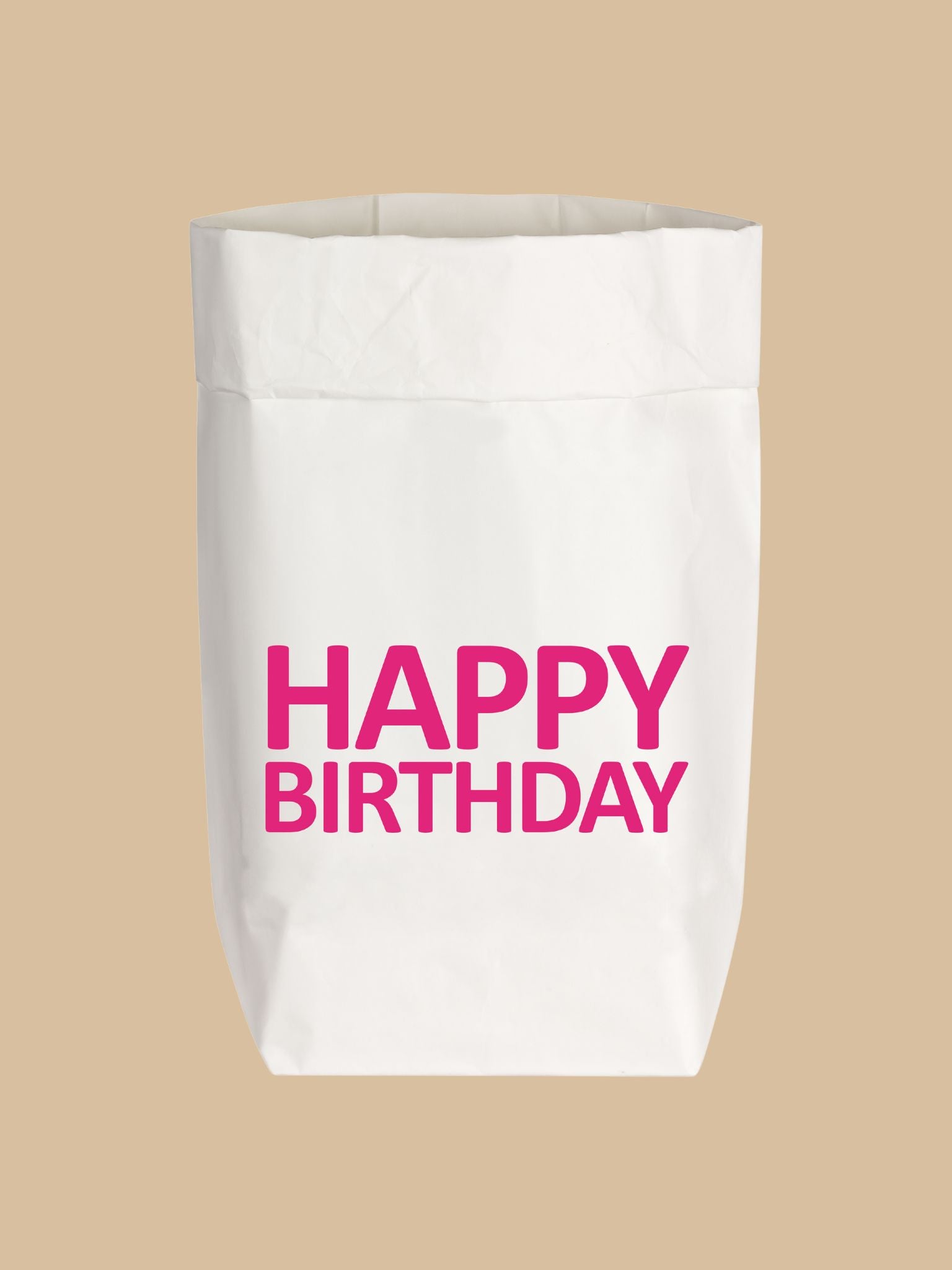 Alle Geschenke finden Platz in der weißen Paperbag "Happy Birthday" mit Schriftzug in Neon-Pink (Nr. 7).