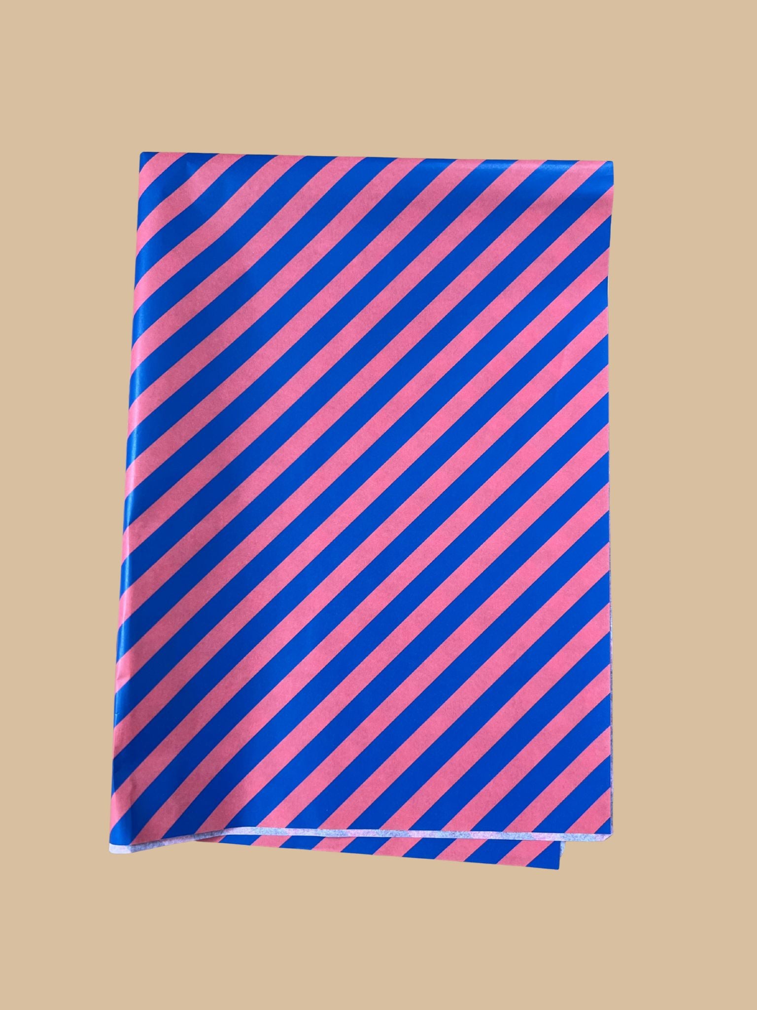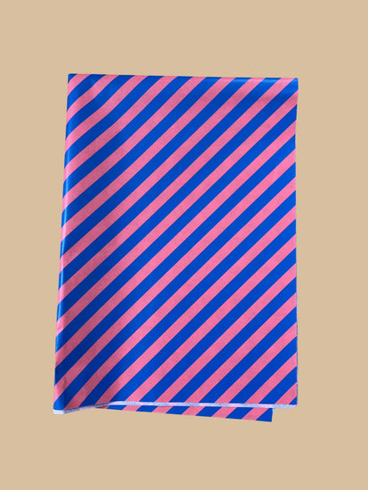Das zarte Seidenpapier in blauem und korallenrotem Streifenmuster lädt mit besonderem Charme zum Verpacken der Geschenke ein. Das seidenartige Papier stellt eine exklusive Alternative zu herkömmlichen Geschenkpapieren dar und hinterlässt einen farbenfrohen Eindruck.