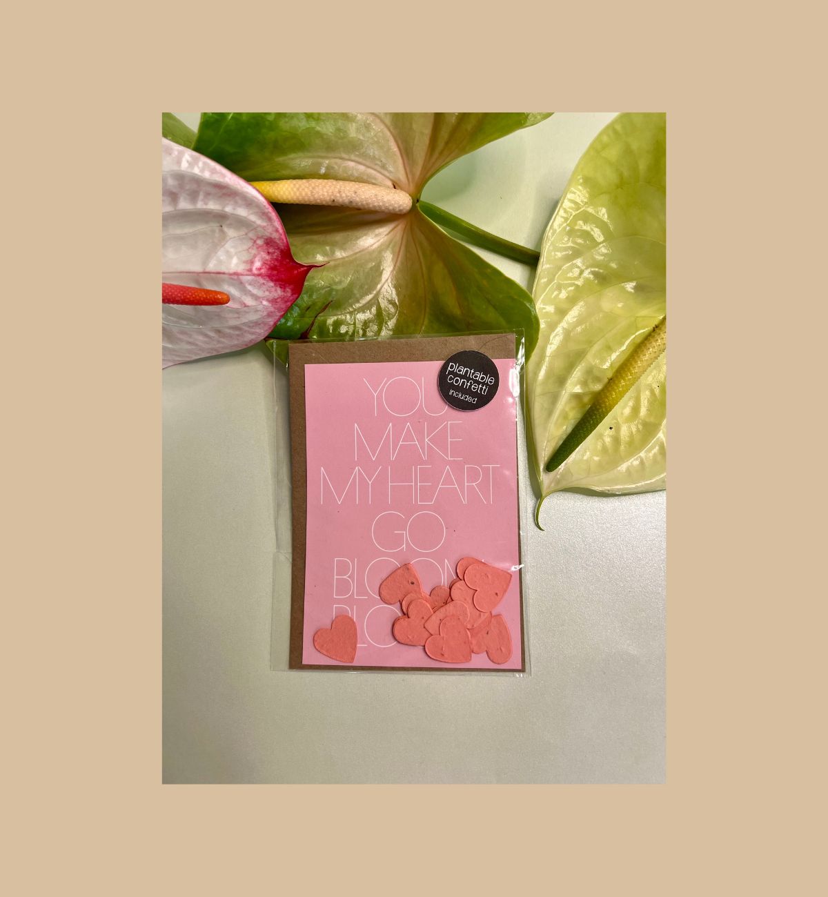 - Produkt: Postkarte mit Umschlag und pflanzbare, rosa Konfetti-Herzen