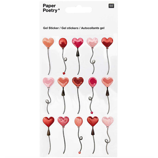 Mit den Gel-Stickern Herzluftballons von Paper Poetry/Rico Design werden gebastelte Karten, bemalte Fotorahmen oder Geschenkschachteln/-tüten/-papier verschönert. Die Gelsticker haften auf allen glatten Untergründen und sind durch ihre vielfältigen Formen und Farben ideal für Verzierungen und Dekoration.