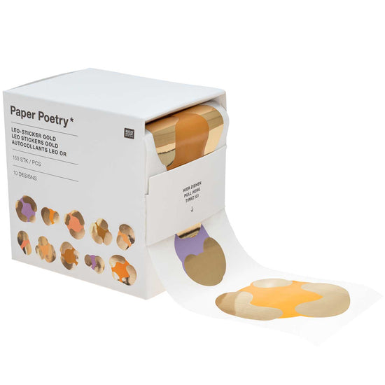 Die großen Papiersticker mit Fleckenmotiv in Leo-Optik von Paper Poetry/Rico Design eignen sich ideal zum Verzieren von Karten, Geschenken, Papiertüten etc.. Die Sticker in Gelb-, Flieder- und Apricot-Tönen werden durch schimmernde Hot Foil-Akzente in Gold ergänzt. Das Set enthält 150 Papiersticker in verschiedenen Leo-Designs. Verpackt sind die Sticker in einer praktischen Spenderbox, bei der auf Plastik verzichtet wurde.