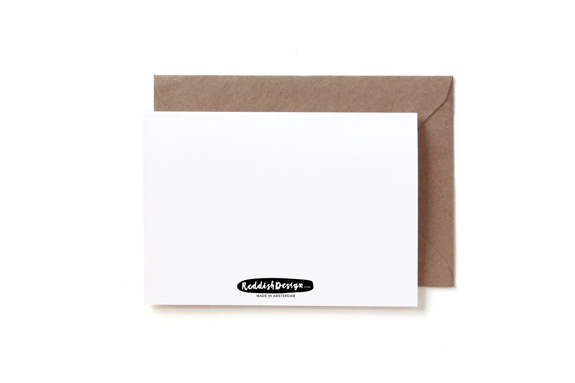 Die Klappkarte wird in Amsterdam auf hochwertigem, recyceltem Bio-Baumwollpapier gedruckt zusammen mit einem braunen, recycelten Umschlag in einer recycelten, durchsichtigen Kunststoffhülle verpackt. Die Karte ist im Inneren unbedruckt.