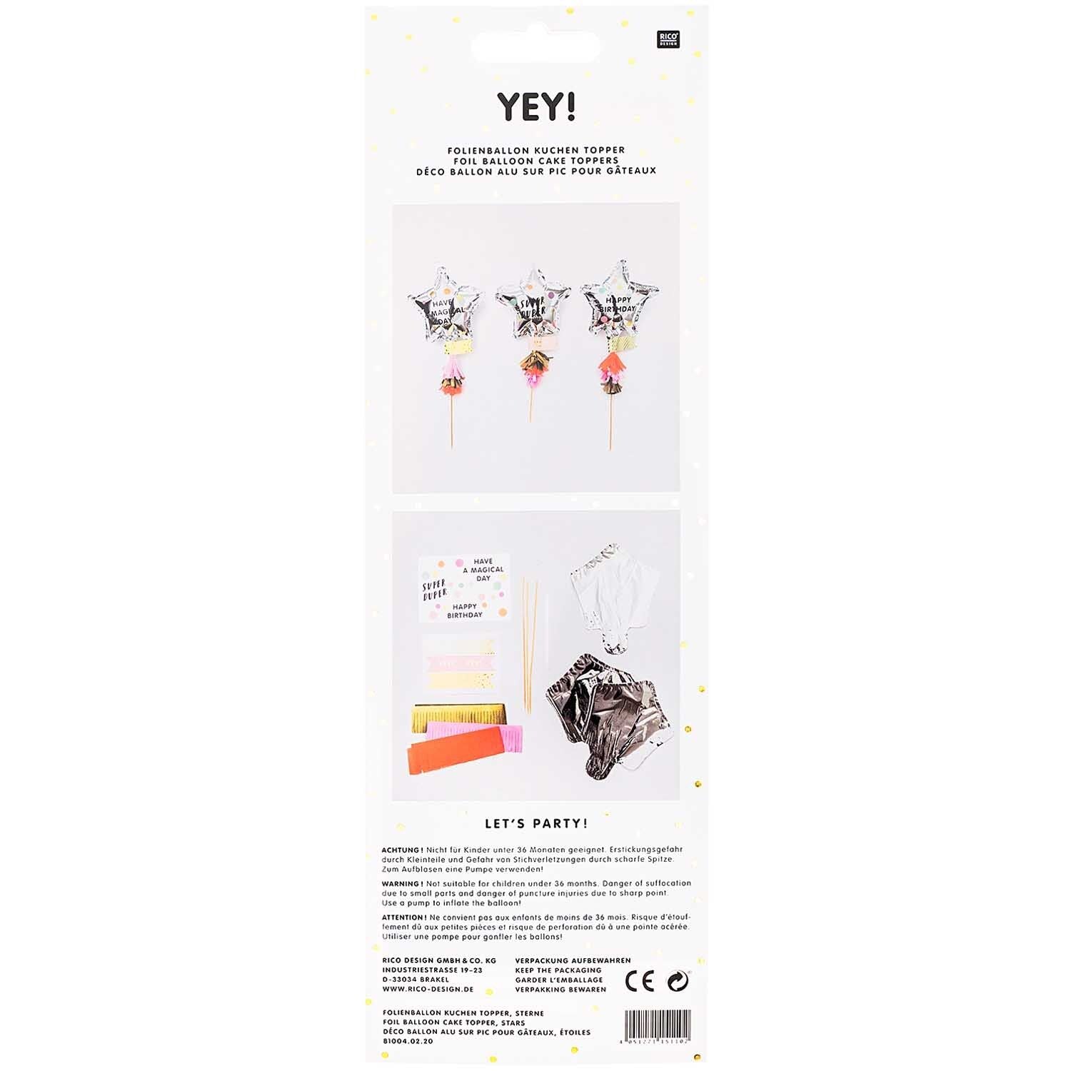 - Produkt: 3 Kuchentopper in Form von sternförmigen Folienballons (ungefüllt) mit Stickern ("Super Duper", Have a Magical Day" und Happy Birthday") und anderen Dekomaterialien zum Verzieren der Topper