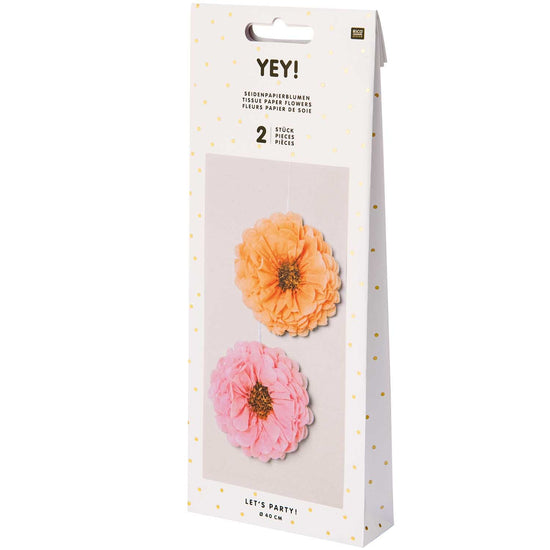 Die zwei farblich unterschiedlichen Seidenpapierblumen gibt es in zwei unterschiedlichen Größen mit einem Durchmesser von 25 cm und 40 cm. In dieser Verpackung sind zwei Stück enthalten, die einen Durchmesser von ca. 40 cm haben. Die Seidenpapierblumen dekorieren das ganze Jahr über sowohl Tische, Fensterbänke als auch Wände. Auch Geschenke und der Geburtstagstisch bekommen durch die Seidenblumen in Pastelltönen einen besonderen Auftritt und gehören zur einer nachhaltigen, wieder zu verwendenden Deko einer Geburtstagsparty, eines Sommerfestes oder einer Hochzeit. Es ist eine Anleitung in der Verpackung beigefügt, die mithilfe von Bildern zeigt, wie die Seidenpapierblumen auseinandergefaltet werden.