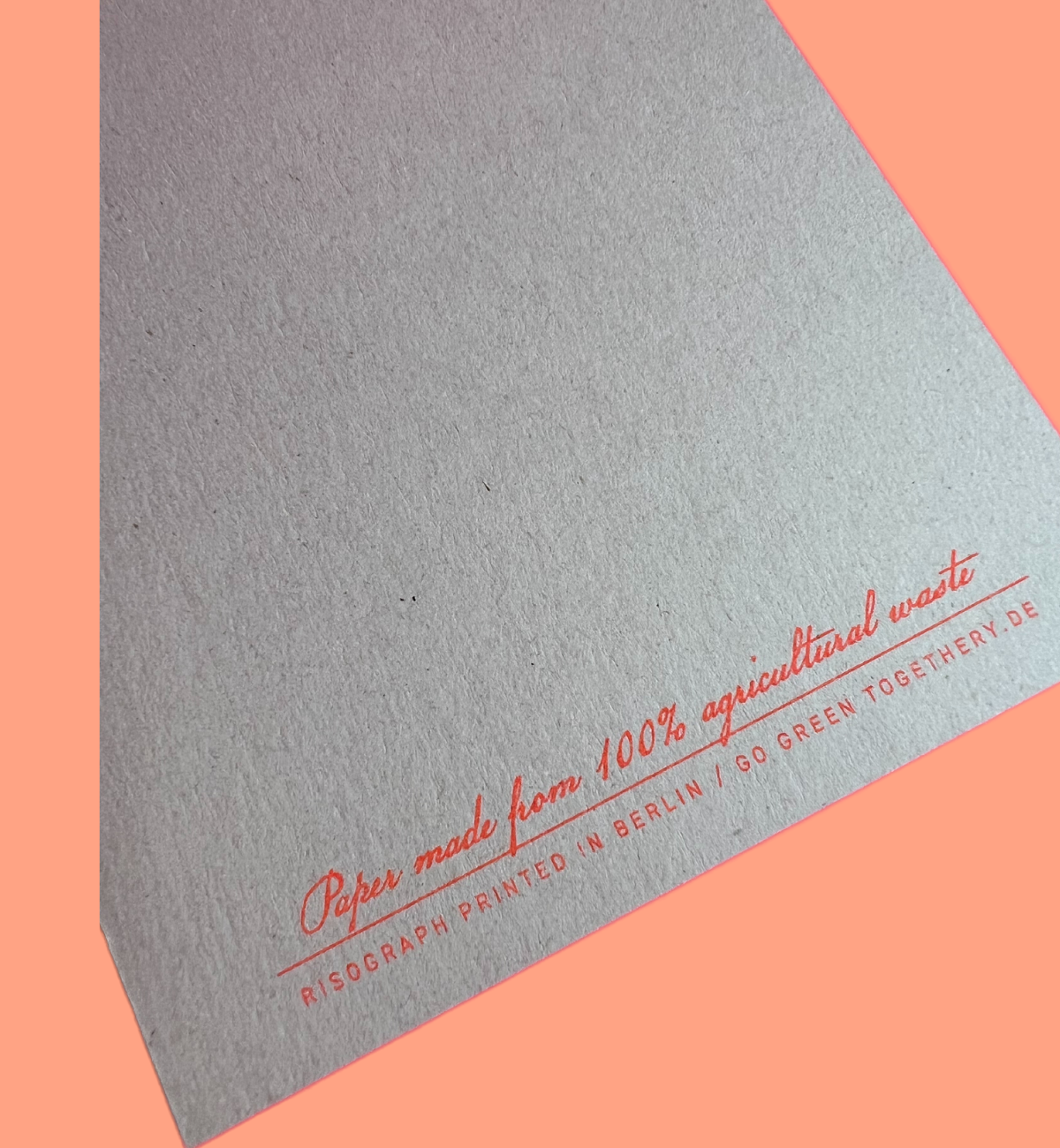 Jede Karte ist ein Unikat und lebt von den künstlerischen Besonderheiten der Risographie. Gedruckt von Togethery in Berlin mit pflanzenbasierter Tinte auf nachhaltigem Naturpapier aus Erntereststoffen der Landwirtschaft.